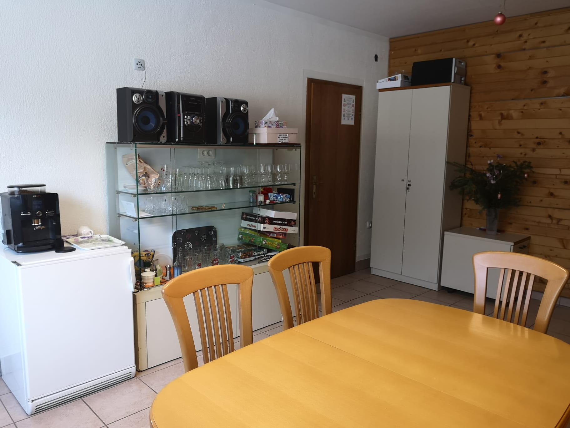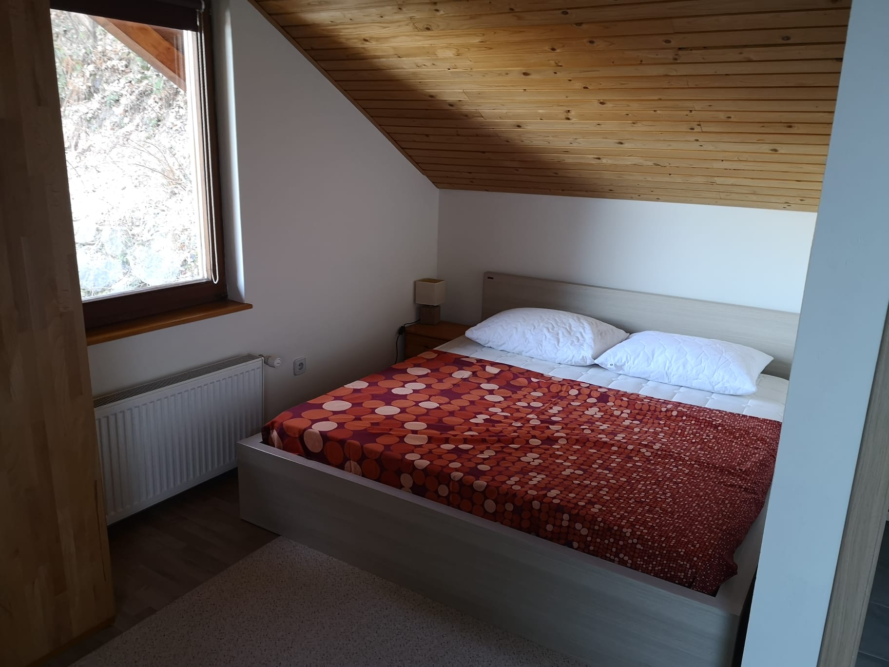 apartma z dvema sobama in dnevnim prostorom:1 soba zakonska postelja + raztegljiv kavč · 2 soba: 2 enojni postelji · 2 kopalnici (vsaka enota svojo) · skupna opremljena kuhinja · prostor za druženje (velik kavč, kamin, ozvočenje, hladilnik, družabne igre) · avtomat za kavo, žar, izvir vode · privat parkirišče, garaža za motorje in kolesa.